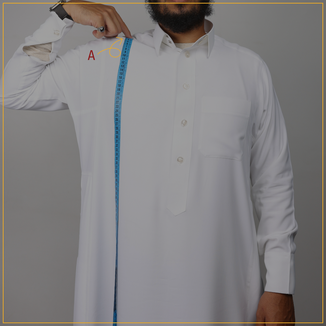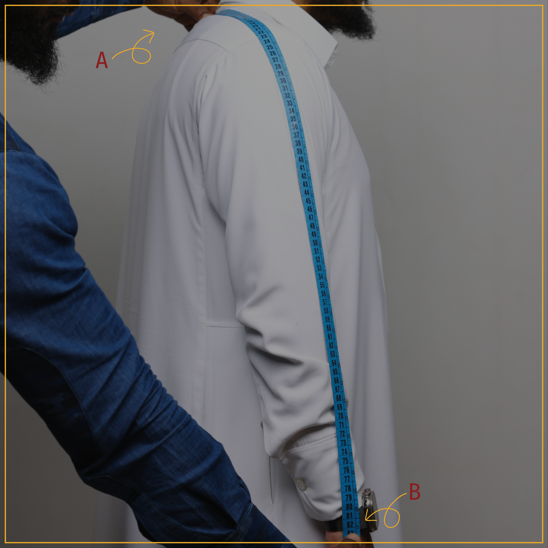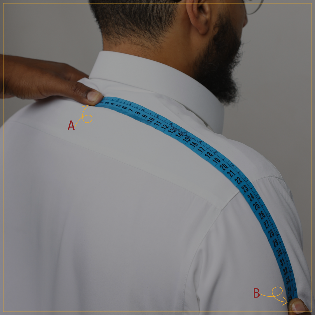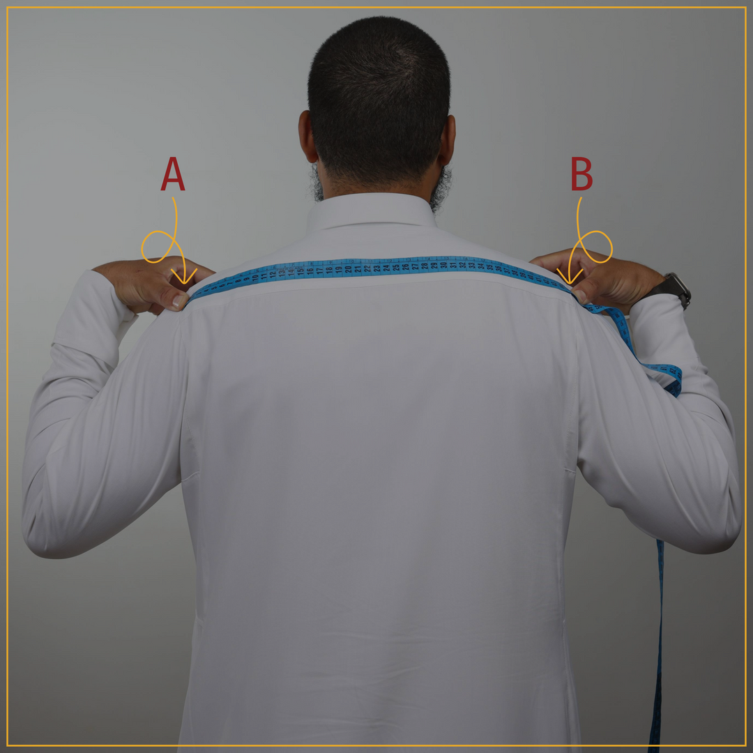 Place the measuring tape on your shoulder directly above your armpits. Measure the area between the left shoulder point (A) and the right shoulder point (B).